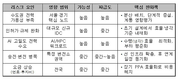 두 번째는 정전·과부하 위험이다. 수도권은 가용 부지 및 공급 제약으로 대형 전력 수요가 급격하게 늘어날 경우 국지적 과부하 위험이 커질 수 있다. 다행히 한국전력의 공급 확인 지연과 허가 절차 강화는 무분별한 증설을 억제하는 역할을 한다. 다만 수요가 특정 변전·송전 구간에 몰리면 계통 스트레스가 커질 수 있고, 안전사고로 이어질 가능성도 있다.